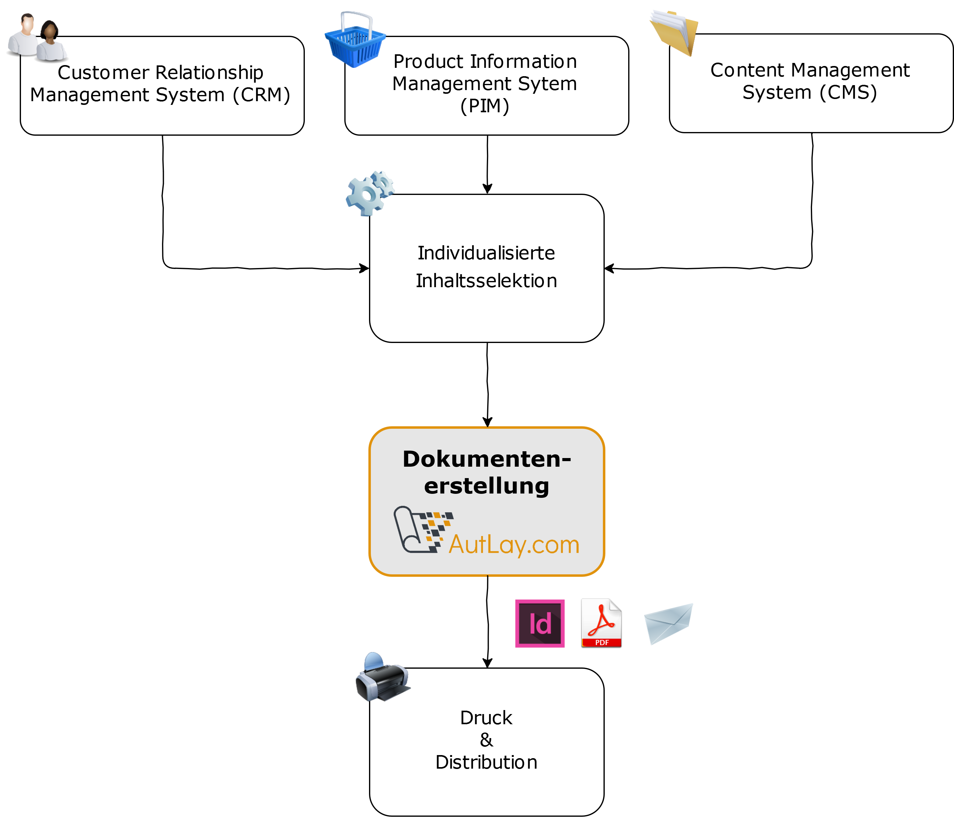 Durch die vollautomatische Erstellung der Dokumenten-Layouts mit AutLay wird eine Massen-Individualisierung auch im Print möglich. Bisher war diese im Print durch eine fehlende automatische Layouterstellung nicht wirtschaftlich. AutLay schließt diese Lücke!